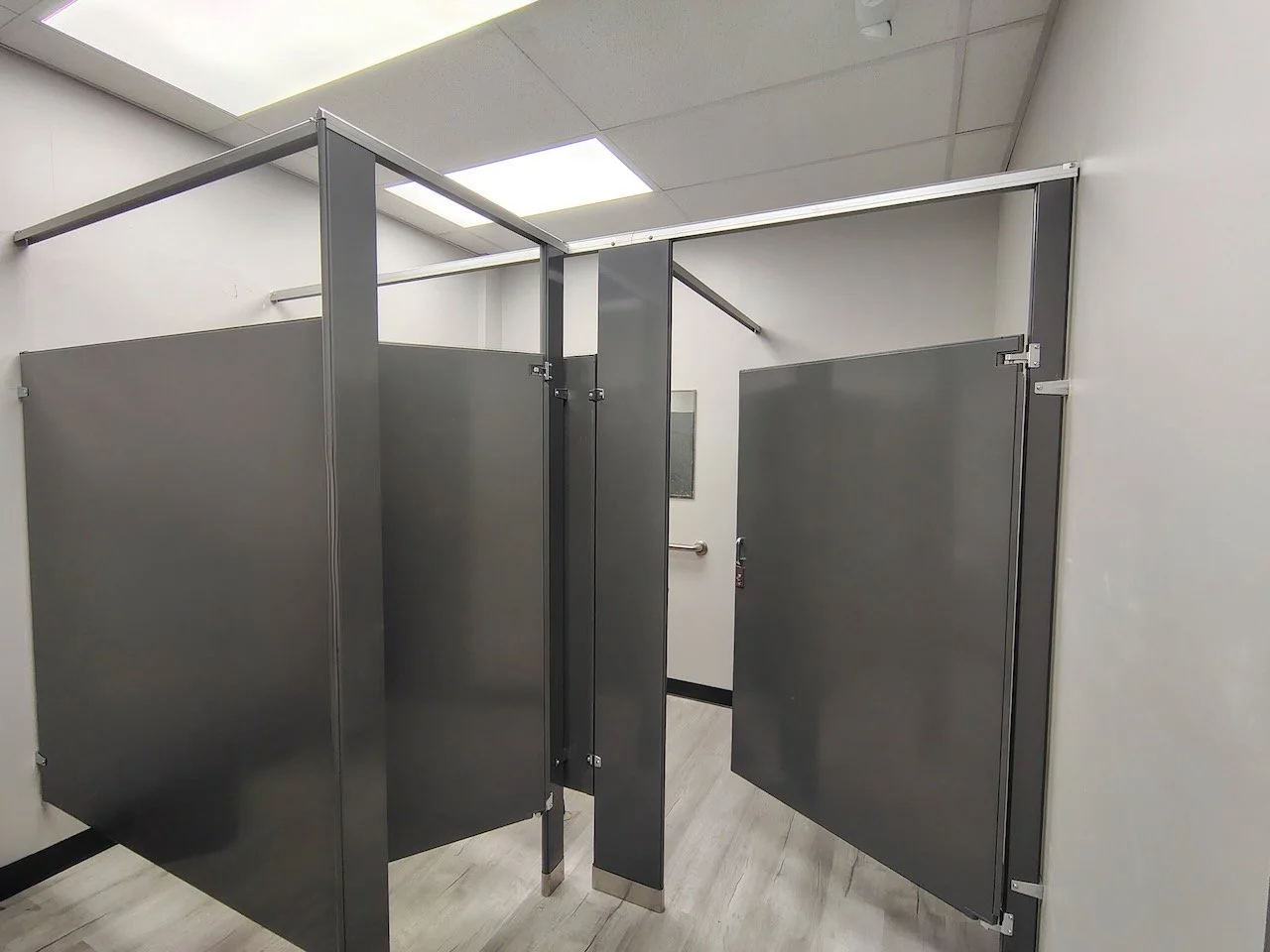 Supply and installation of ADA-compliant commercial restroom partitions (Division 10) in durable materials like solid plastic, powder coated steel, or laminate.