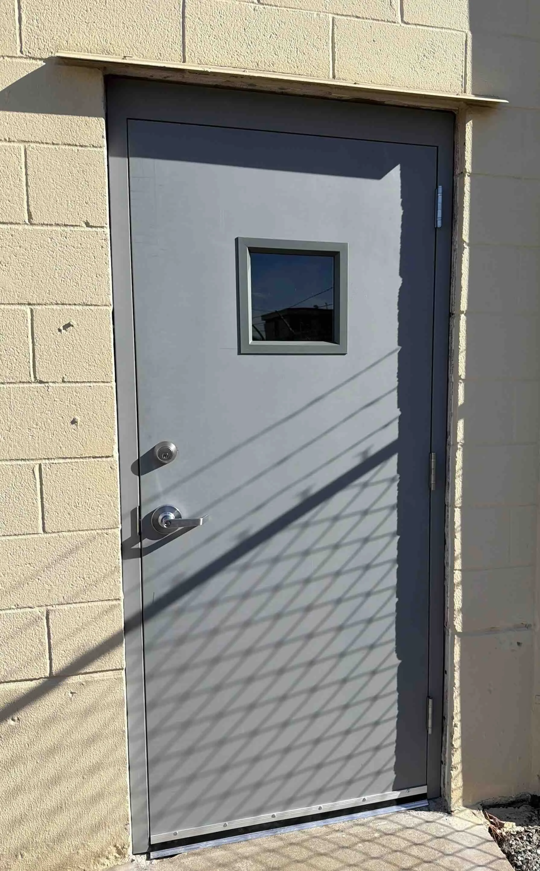 Professional installation of storm-rated hollow metal doors, perfect for high-wind environments such as commercial buildings, warehouses, tornado shelters, and storm-safe rooms.